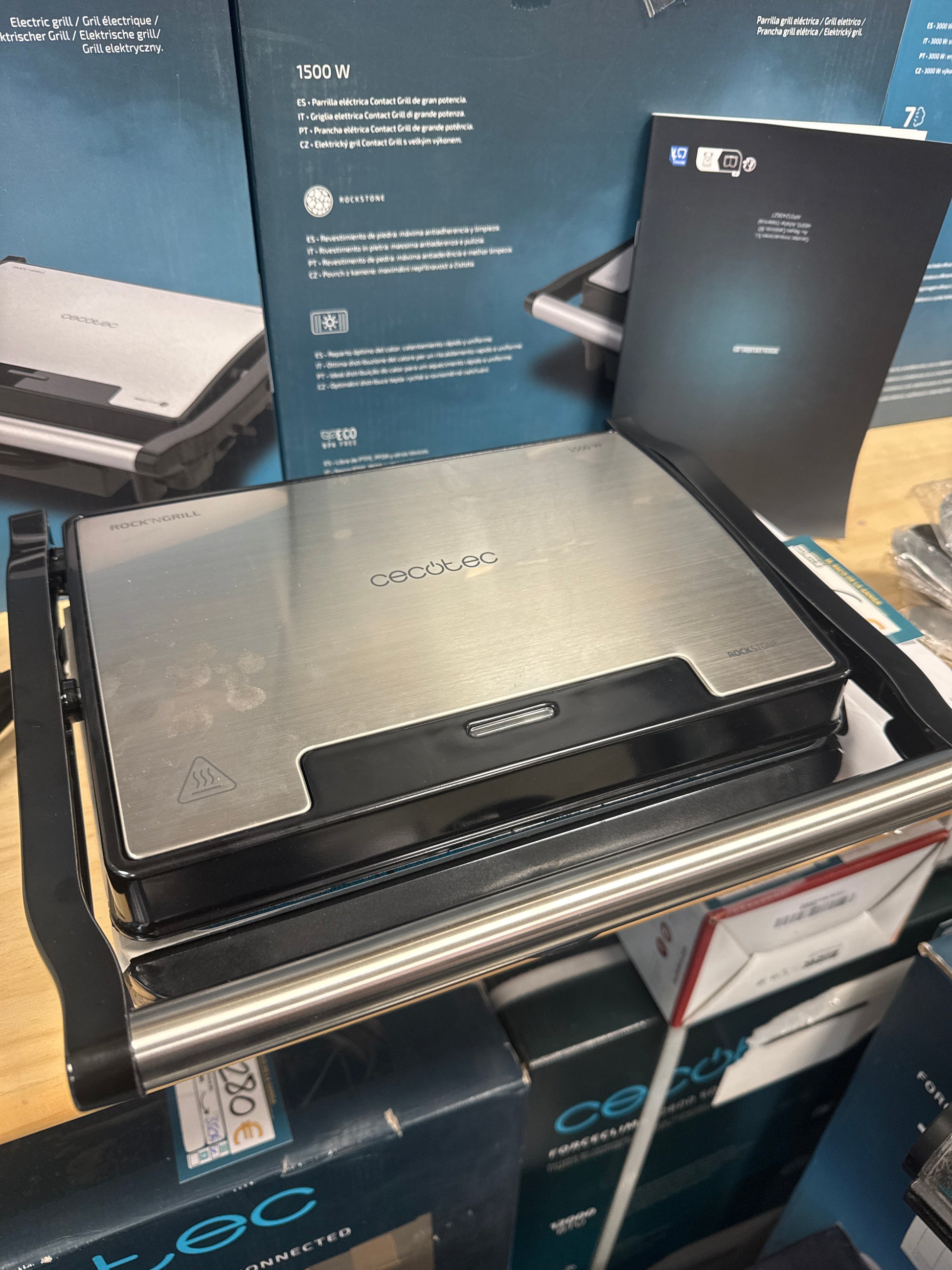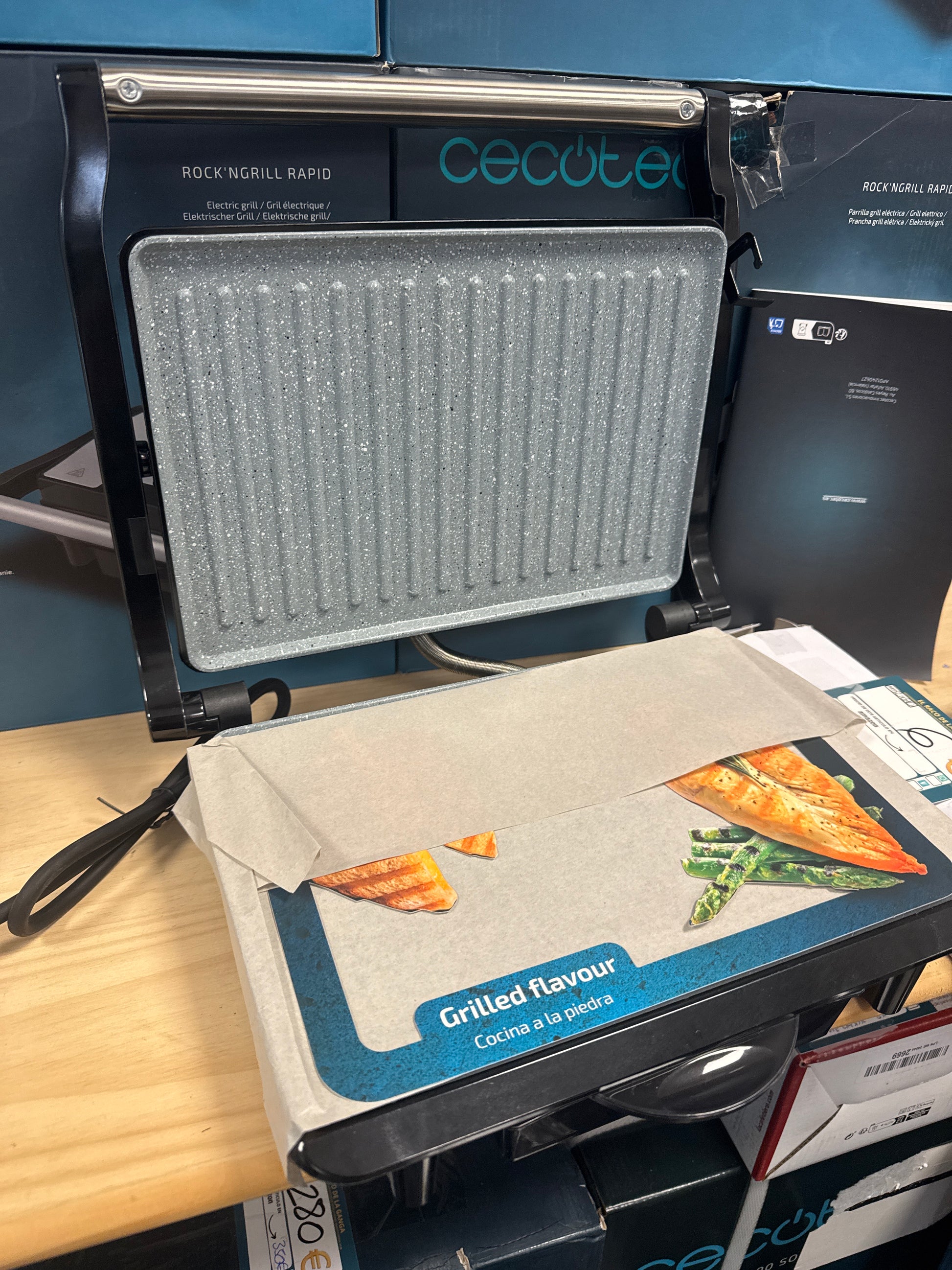 Cecotec Parrilla Eléctrica Rock'Ngrill 1500 Rapid, 1500 W, Revestimiento de Piedra Rockstone, Placa Superior Adaptable en Altura, Bandeja Recogegrasas, Revestimiento Ecológico, 12.4X30.8X33.2 Cm